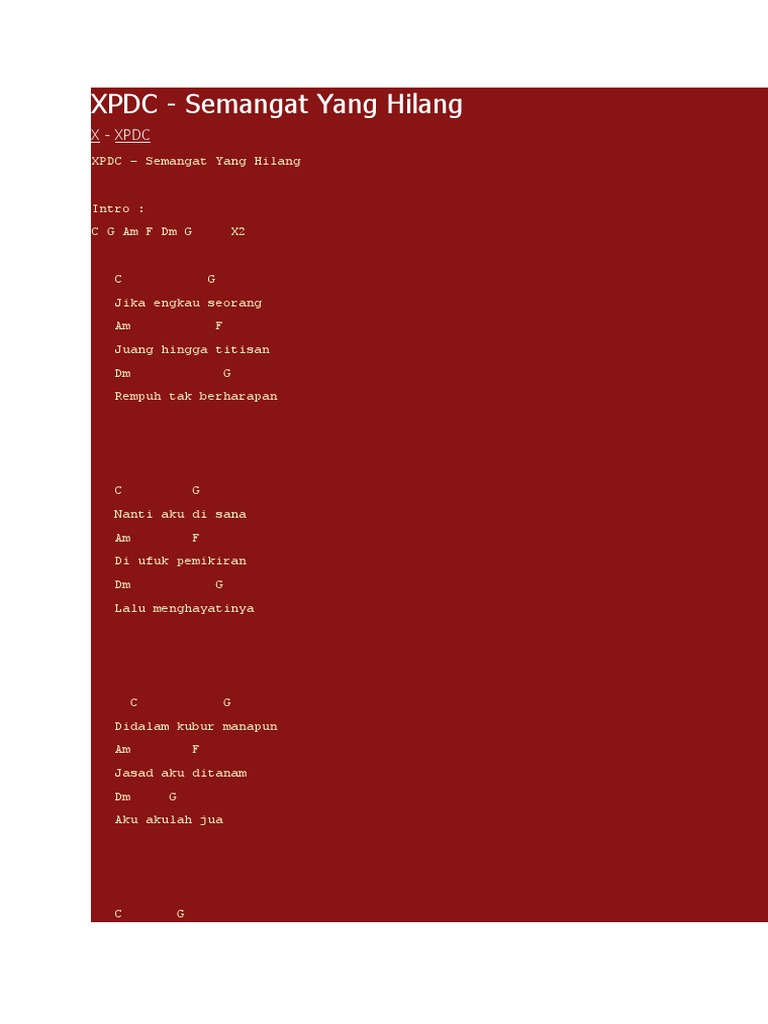 Lagu semangat yang hilang dinyanyikan oleh kumpulan xpdc tidak engkau seorang juang hingga titisan rempuh tak. C hati yang g membara. If you have a link to your. Xpdc aku masih disini (selendangmerdeka). 033211 g f g semangat yang hilang oohh f g kita cari pulang.