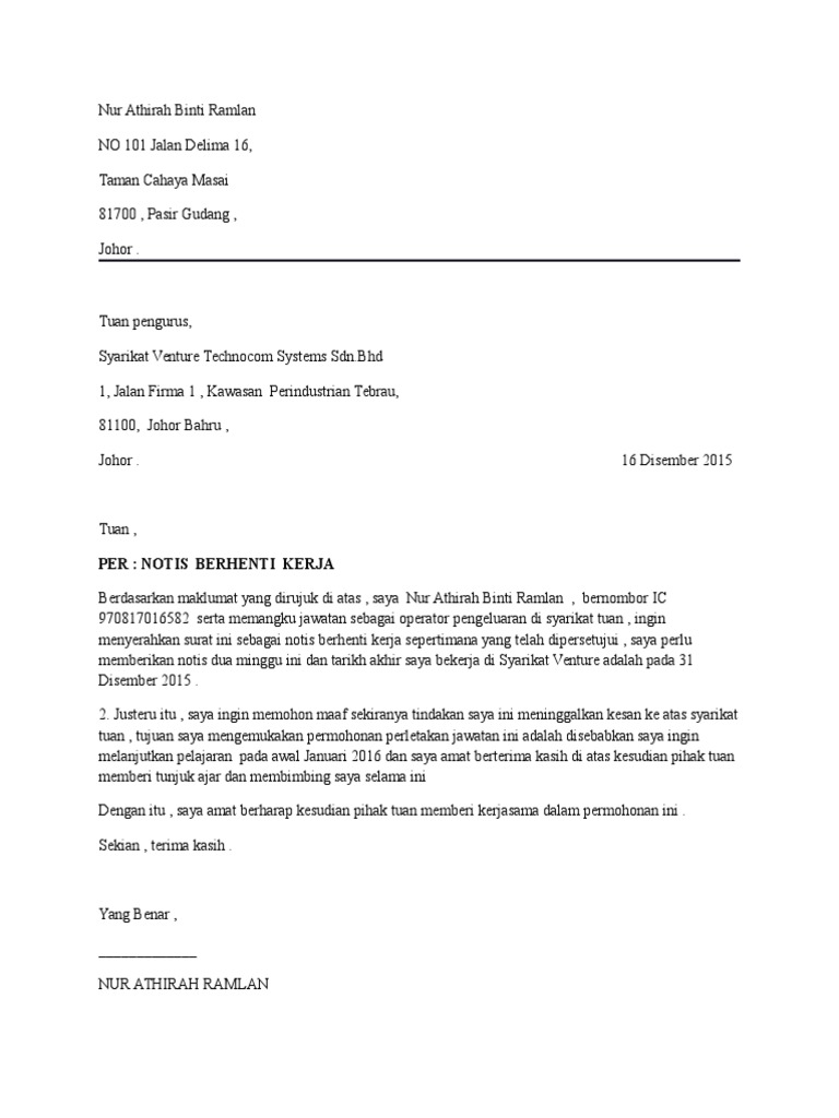 Sebelum menghantar surat ini pastikan anda menyemak dahulu perjanjian antara anda dan majikan. Untuk sambung pengajian aku pada tahap diploma pulak. Contoh surat keterangan kerja adalah suatu jenis surat resmi yang dikeluarkan oleh sebuah perusahaan atau instansi tertentu yang intinya untuk menyatakan bahwa seseorang memang sedang dalam periode kerja pada perusahaan atau instansi yang bersangkutan. Berikut adalah contoh surat rasmi berhenti kerja dalam bahasa melayu yang merangkumi notis perletakan jawatan sama ada dalam 24 jam atau sebulan. Samada anda kerja kerajaan, kilang atau sebagainya, pastikan pada ketika anda hendak hantar surat letak jawatan atau surat berhenti kerja dengan notis 24 jam, serta merta, notis sebulan, notis seminggu anda.